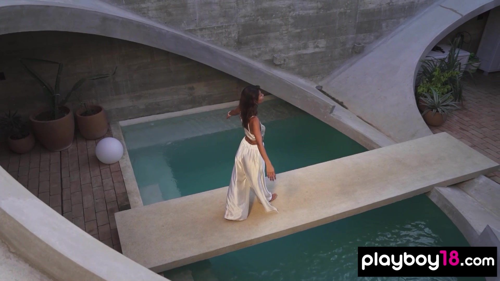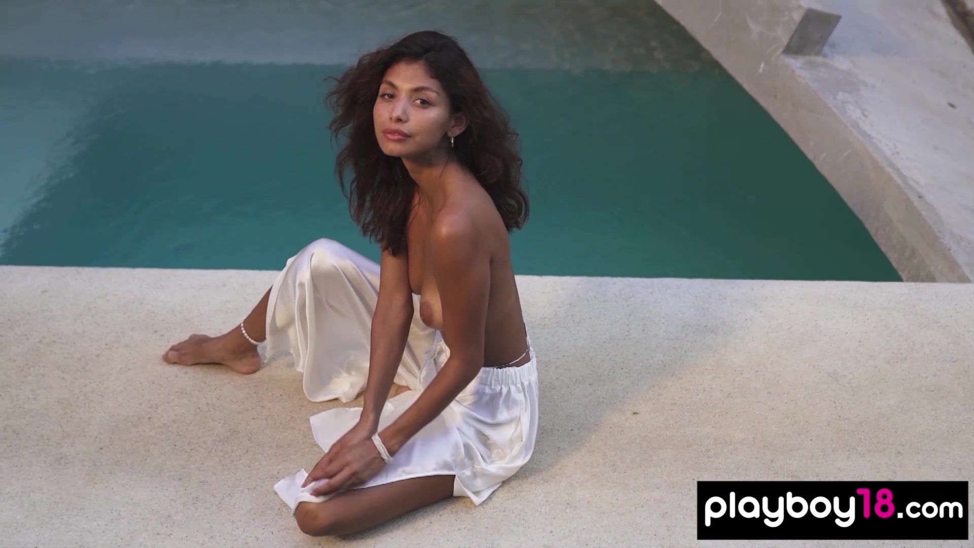 This petite latina teen named Carolina Reyes has special talent she is positive in any circumstance she loves nude swimming so she takes off her fancy dress and reveals us her perfect natural tits and her dark pussy then she jumps into the pool
